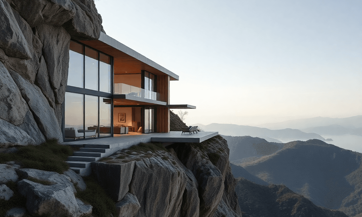 - Raw stone surfaces echoing the cliff formations